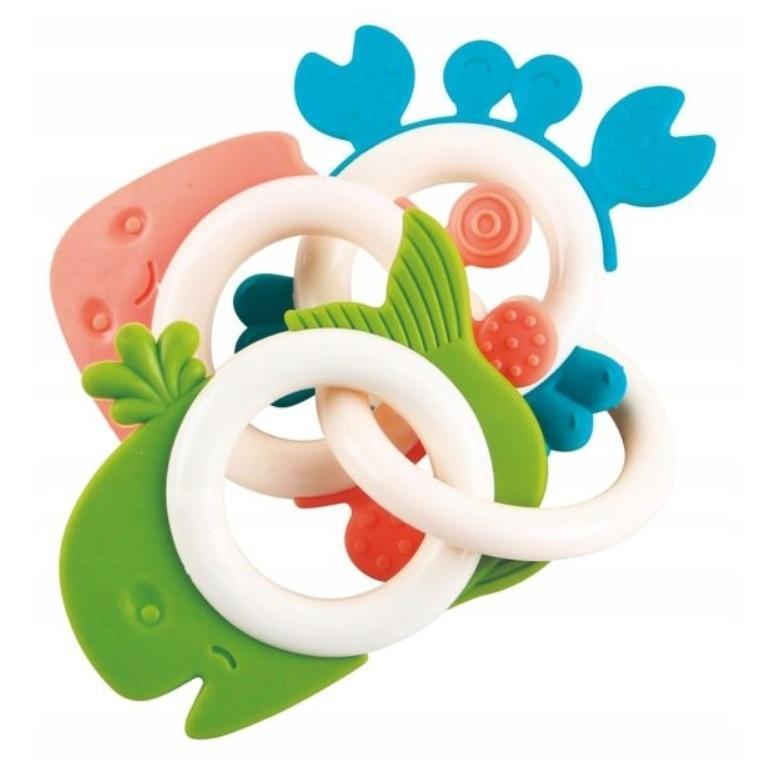 Towarzysze ząbkowania w oceanicznej odsłonie! Trzy gryzaczki spięte są wspólnym kółeczkiem, które stanowi zarazem praktyczny uchwyt. Każdy z nich odznacza się innym kształtem oraz kolorem. Gryzaczki posiadają wypustki, które podczas gryzienia delikatnie masują obolałe dziąsła ząbkującego maluszka.