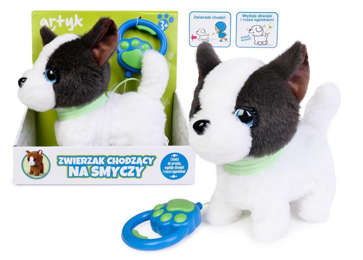W zestawie: zwierzak na smyczy wys. 21 cm, funkcje: po naciśnięciu przycisku na smyczy piesek: szczeka, macha ogonem, rusza głową, chodzi do przodu, wymiary opakowania 24,8 x 26 x 11 cm, baterie: 3 x AA niedołączone, 3+