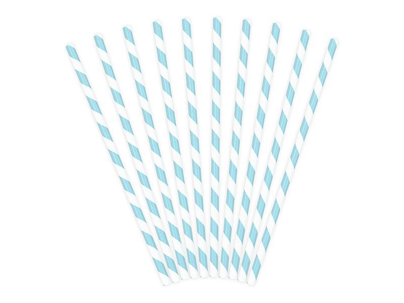 Słomki papierowe w kolorze błękitnym z białymi ukośnymi paskami, długość około 19,5 centymetra.(1 op. / 10 szt.)